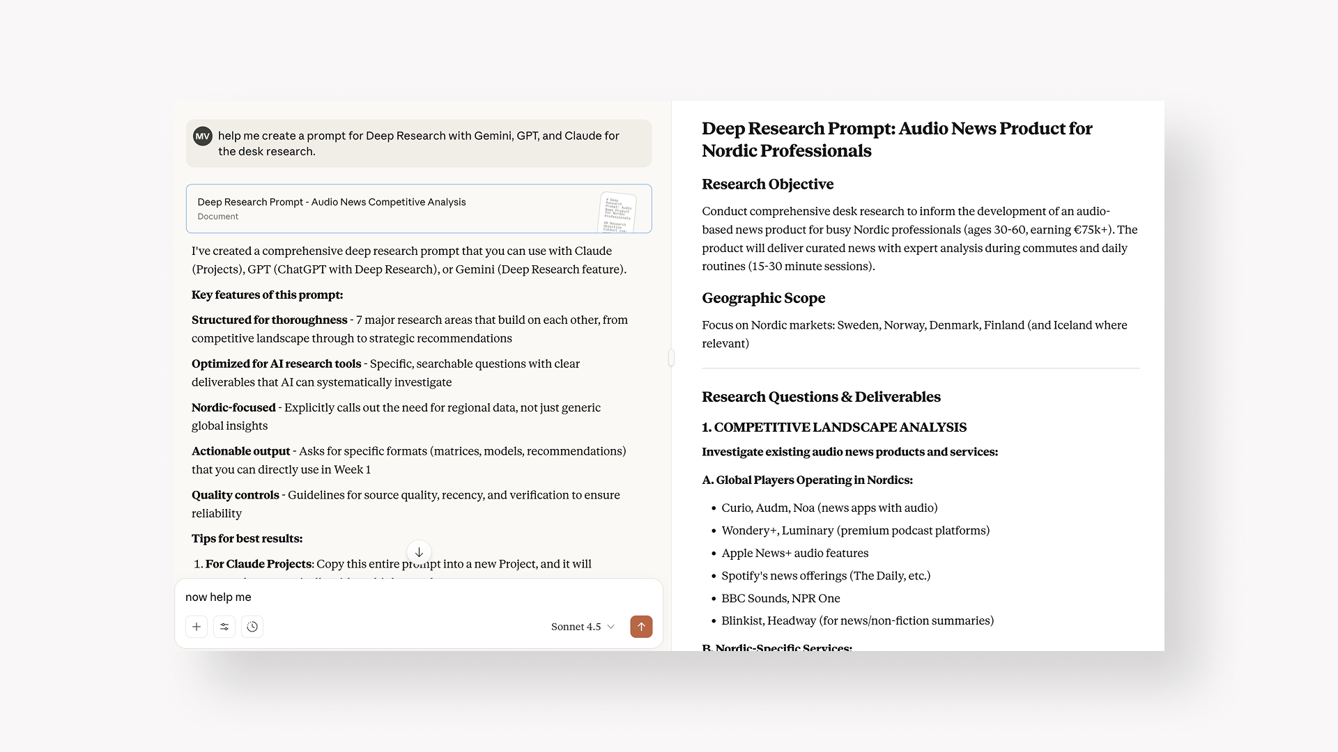 FIRST STEP: "Help me create a prompt for Deep Research with Gemini, GPT, and Claude for the desk research."