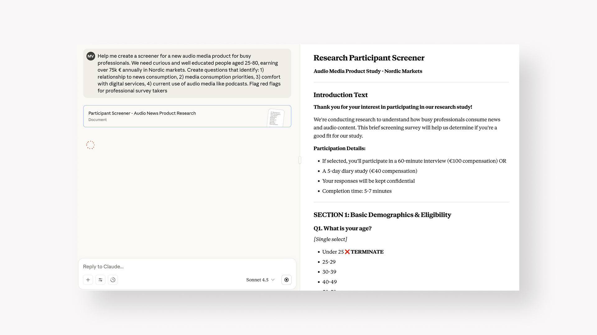 Example AI participant screening prompt: "Help me create a screener for a new audio media product for busy professionals. We need curious and well educated people aged 25-80, earning over 75k € annually in Nordic markets. Create questions that identify: 1) relationship to news consumption, 2) media consumption priorities, 3) comfort with digital services, 4) current use of audio media like podcasts. Flag red flags for professional survey takers."