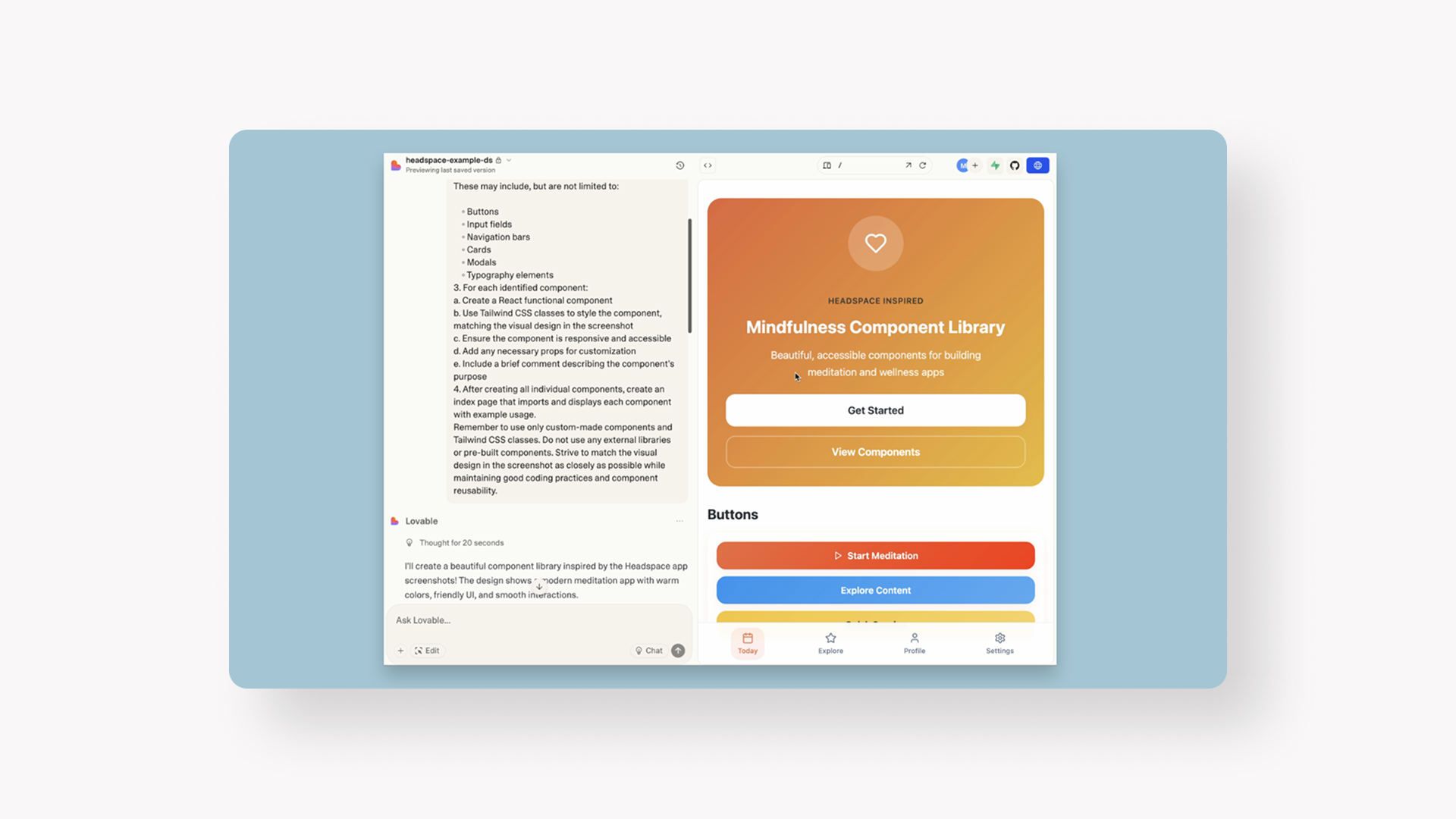 For a more comprehensive component library, ask Lovable or Cursor to create an HTML page with real components for your brand based on screenshots. This component library acts as a foundation for future sessions. As an experiment, I created a Headspace themed component library with Lovable based on screenshots of the actual Headspace product.