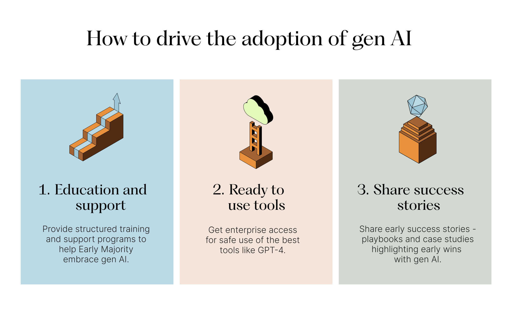 To make the Early Majority feel comfortable getting started with generative AI, I recommend the following: