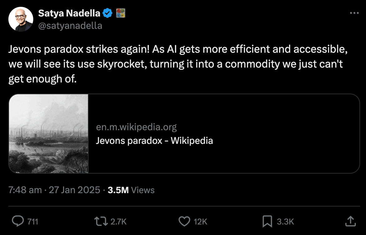 Many commenters - including Microsoft CEO Satya Nadella - have referenced Jevons Paradox as a possible outcome.