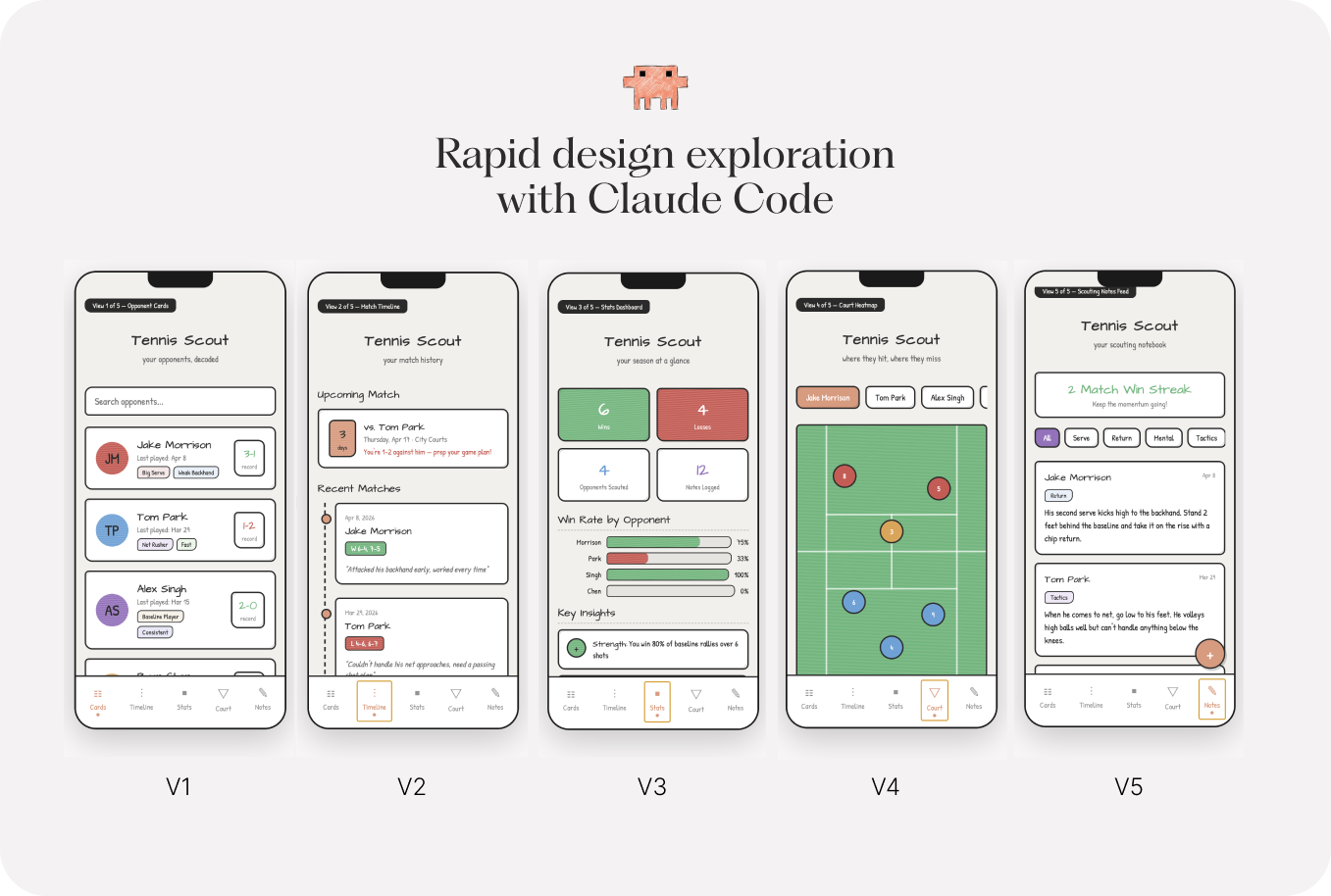Recently, working on a tennis opponent scouting app, I asked Claude Code to explore five different ways to design the home view of the app. I delibrately asked it to use a sketchy wireframe style. Exploration is almost free, it took me about 5 minutes to explore the directions in Claude Code, before investing more time in one of them.