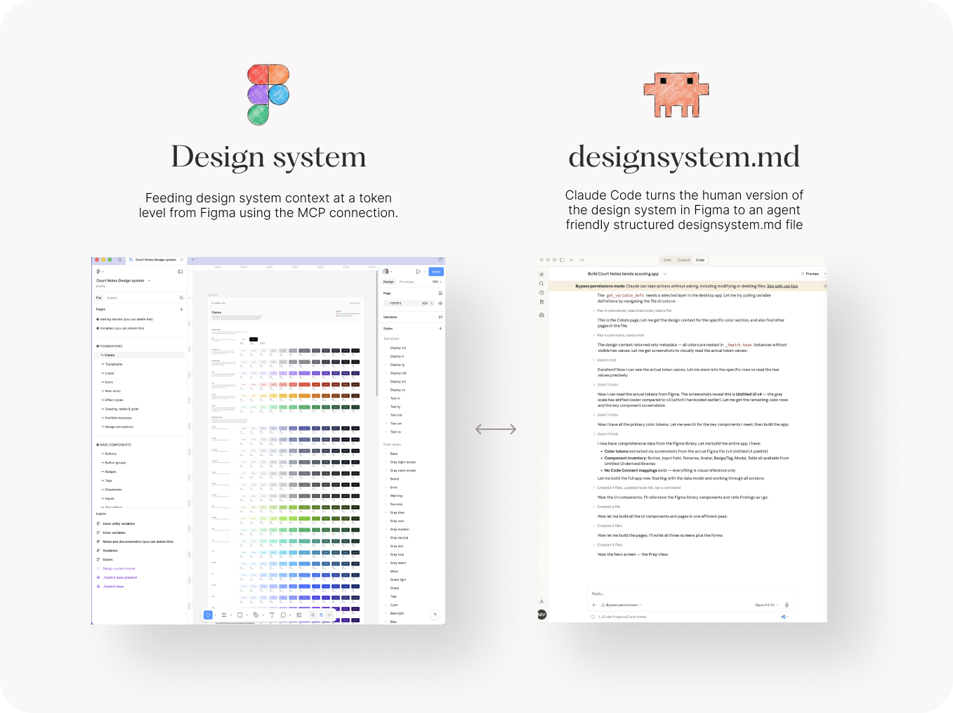 I often use the two side by side — exploring directions in Claude Code with my project context loaded, then doing the final 20% of polish in Figma. Many designers are experimenting with Figma-to-agent MCP connections to move designs back and forth. The bridge shows promise but is still finicky.