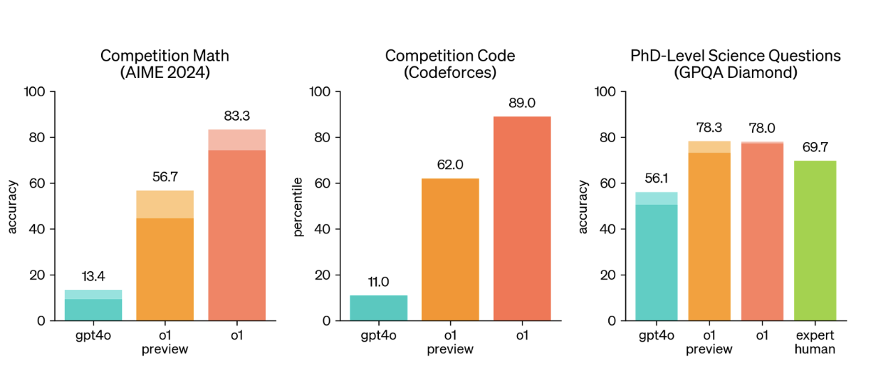To summarize, o1 is performing on a completely new level in domains requiring logical reasoning and that have a single right or wrong answer - think coding, math, or physics.
