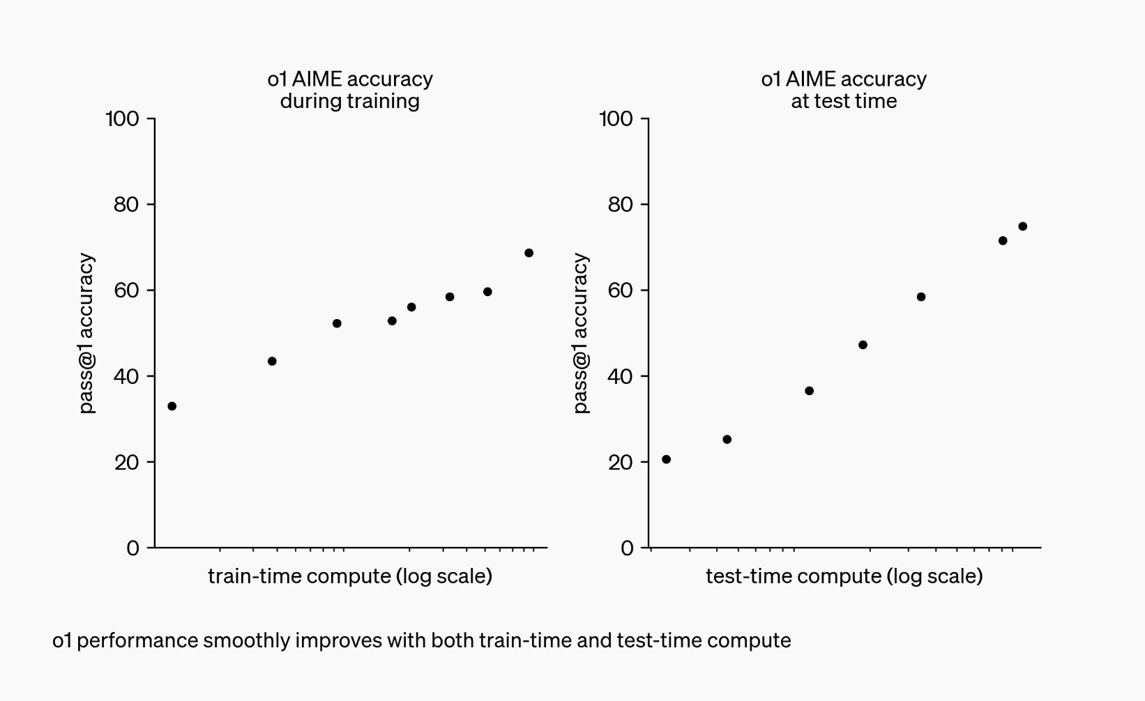 The performance of o1 improves both with how long its trained (on the left) and how long it’s able to think (on the right). Source: OpenAI