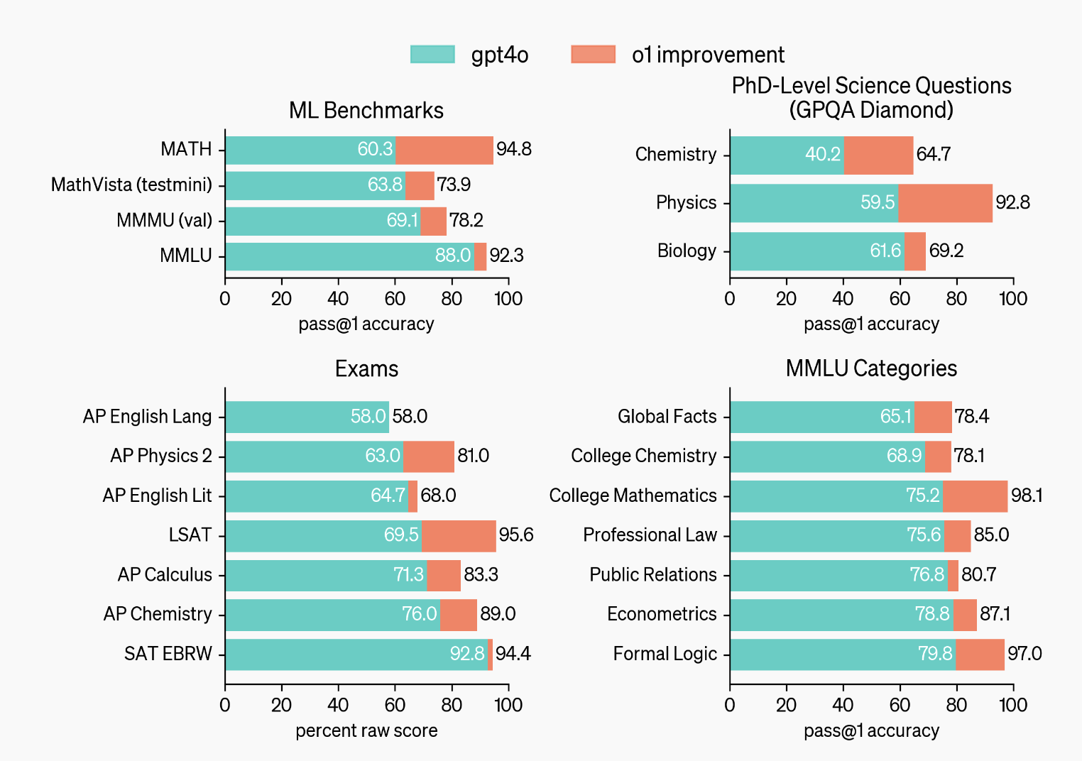 The new o1 model clearly outperforms GPT-4o in several key benchmarks - most notably in STEM areas like math, physics and coding. Notably, it hasn’t improved in English language over GPT-4o.