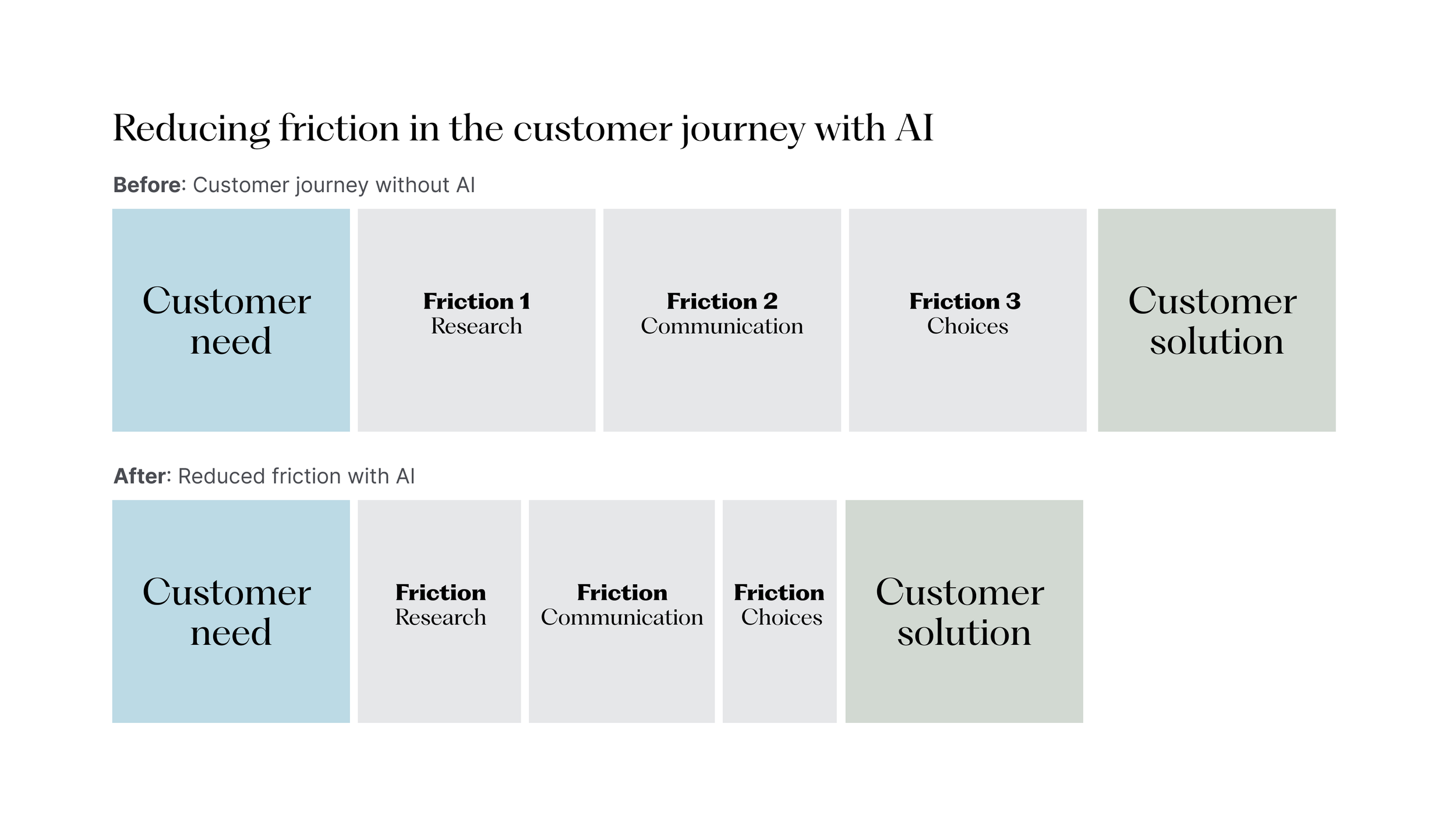 Next, let's unpack each of these categories of friction (Research, Communication, Choices) along with cases from other companies using AI to reduce their customers' friction.