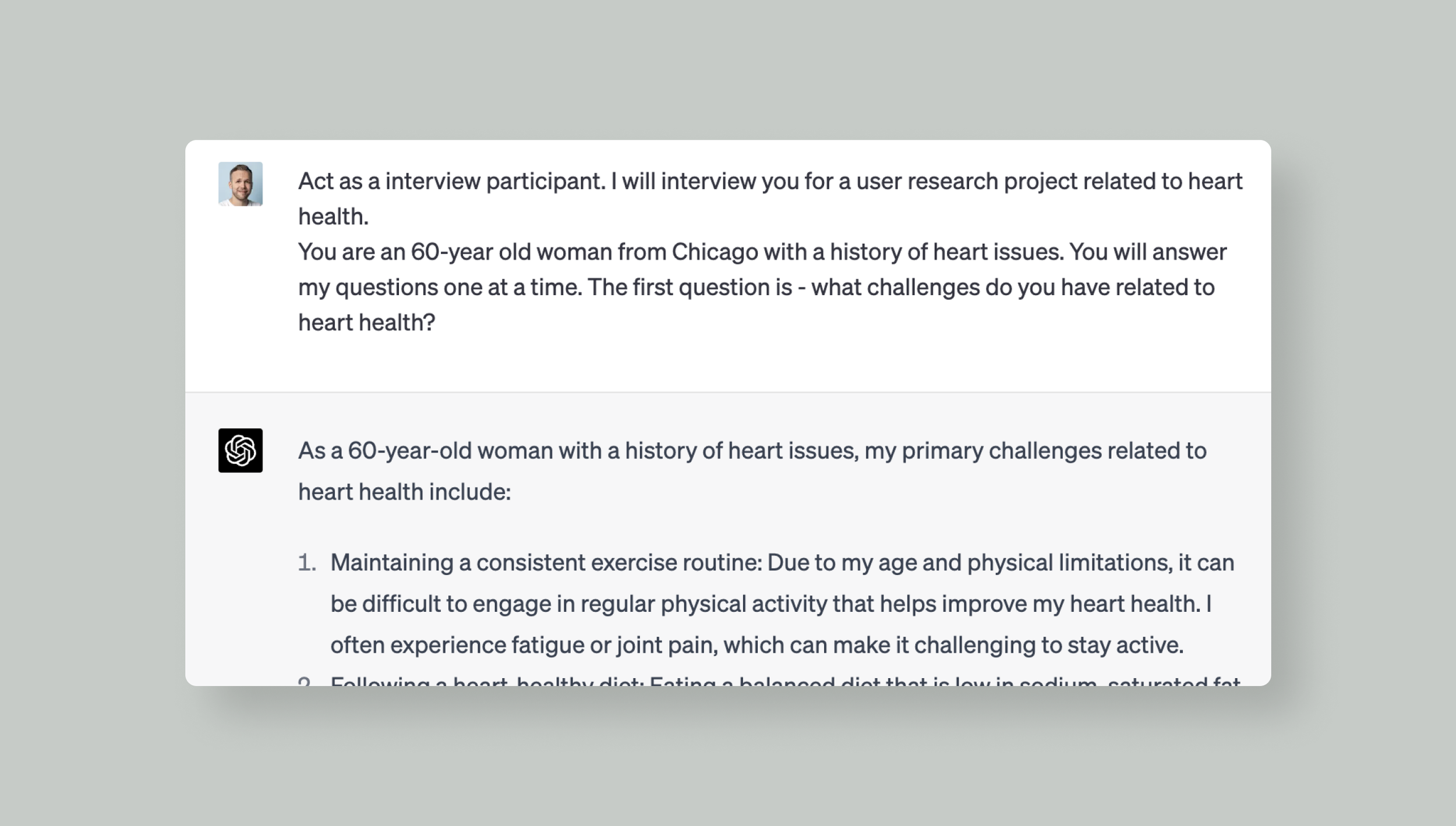 Ask ChatGPT to “act as an interview participant. I will interview you for a user research project related to heart health. You are a 60-year old woman from Chicago with a history of heart issues. Answer my questions one at a time. The first question is...”