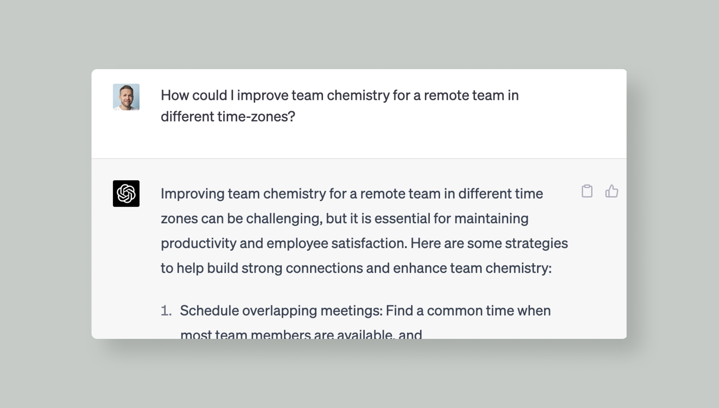 Begin your prompts with "How," "Why," or "What," such as "How could I improve team chemistry for a remote team in different time-zones?" or "What are the core principles of data visualization that help produce insights?"
