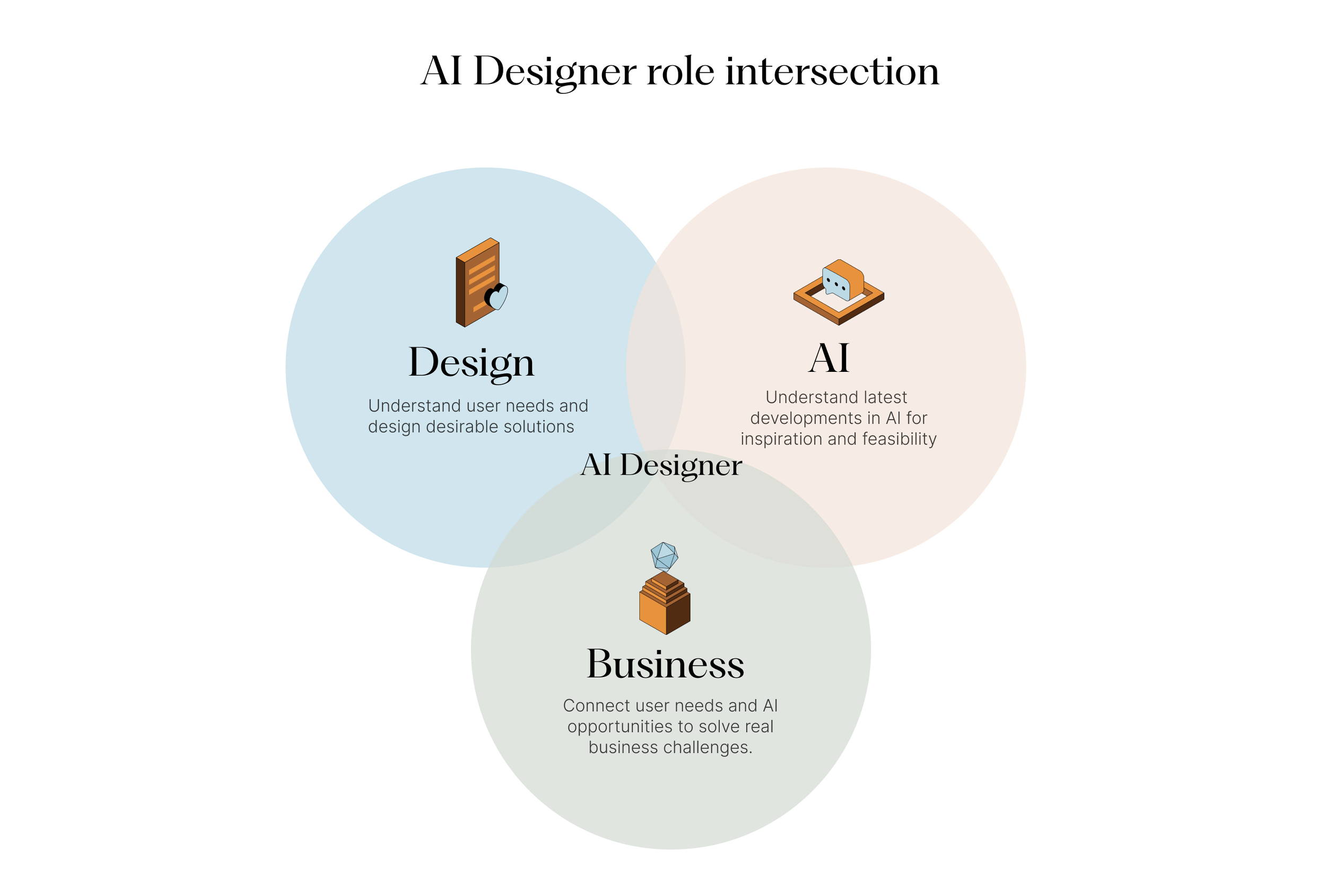 As you can see above, the role of an AI designer sits at the intersection of design, AI technology, and business. They lead the discovery and design of new practical AI solutions to real business challenges.