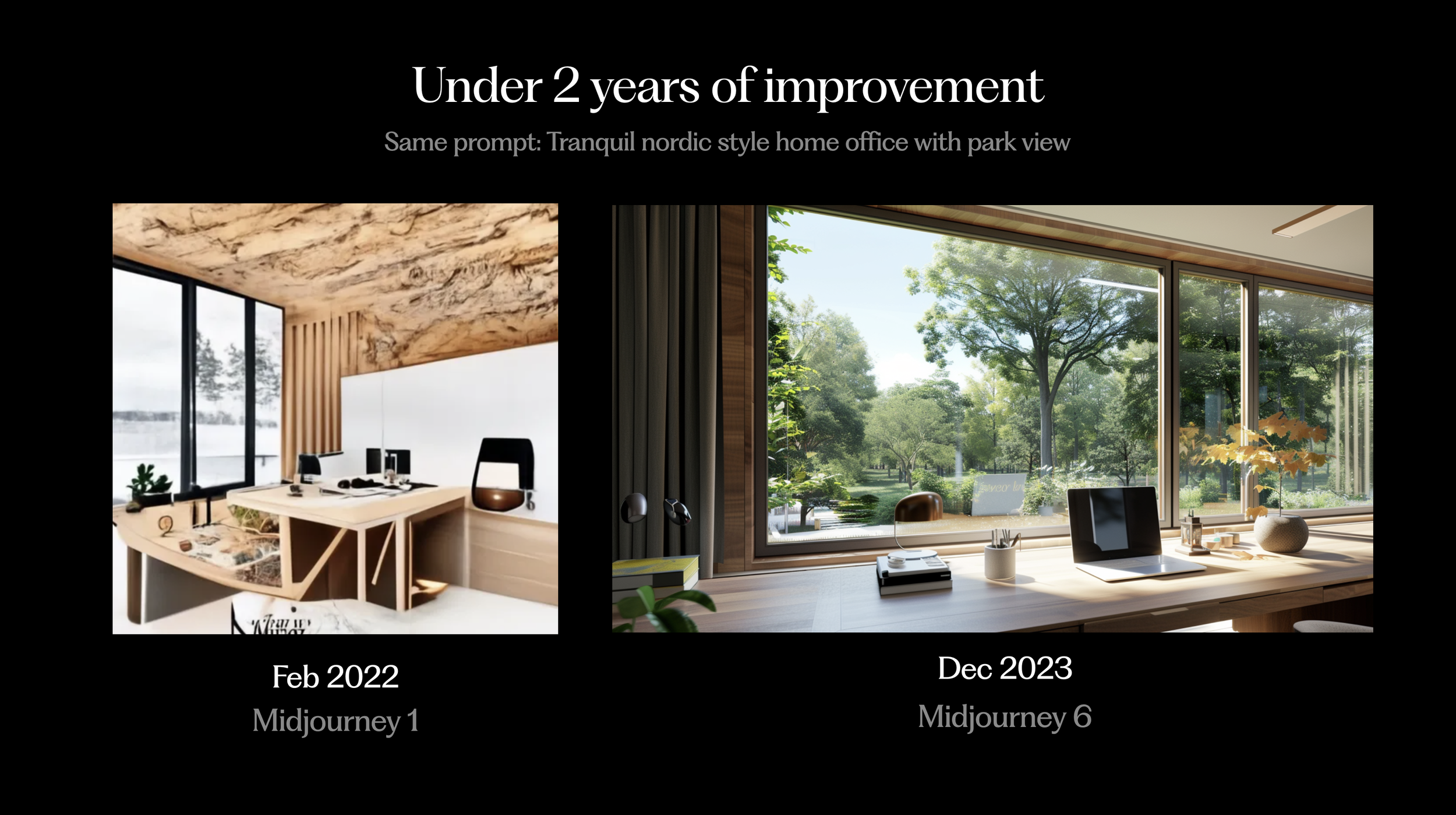 In the images below, you can see an image of a “tranquil Nordic style home office with park view” from Midjourney V1 in February 2022 and V6 in December 2023.