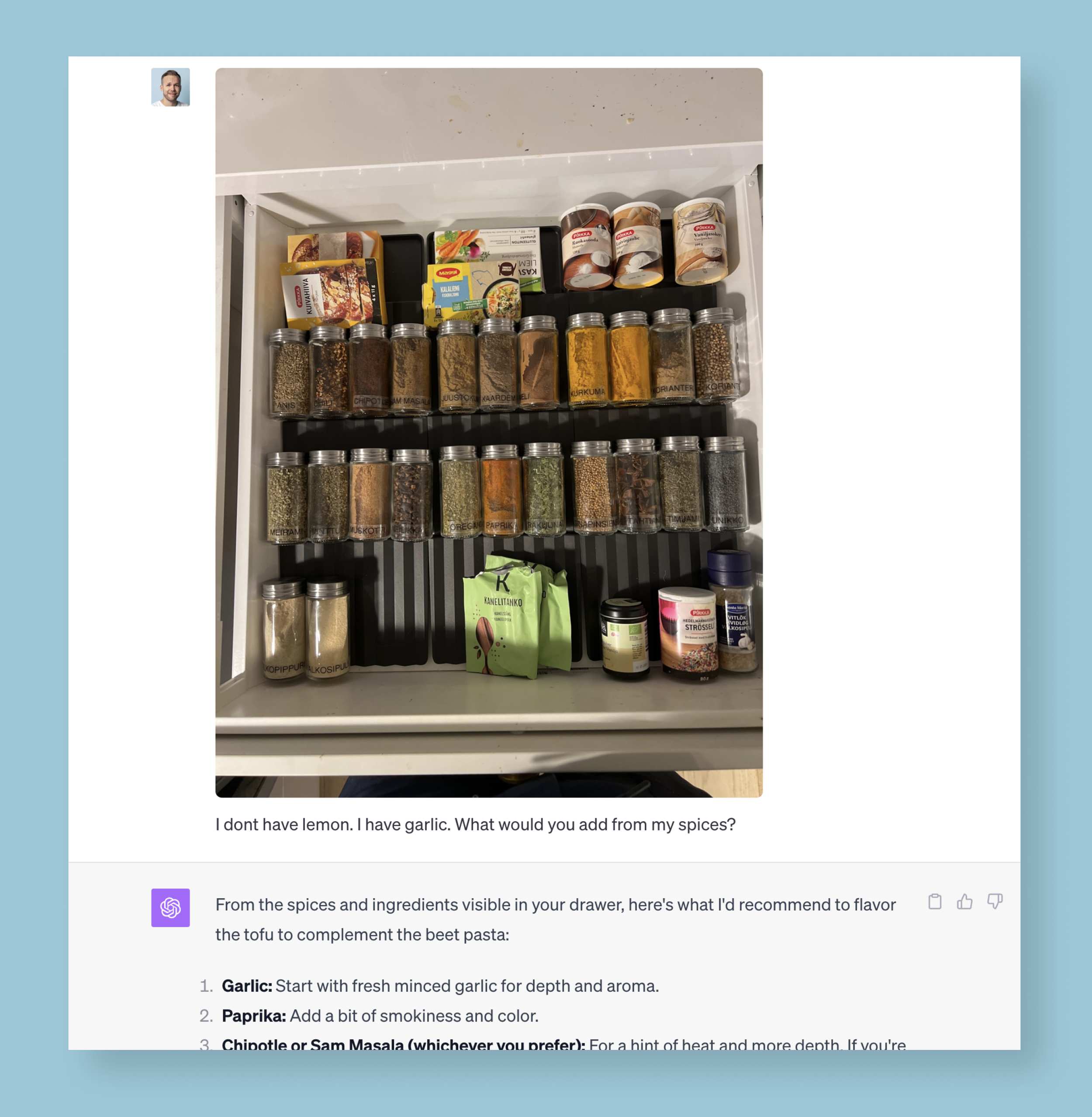I took out my phone and snapped a photo of my spice drawer. GPT-4, now equipped with vision, could recommend the exact spices from my collection to go with my pasta. It could analyze the contents of my spice rack and how they would fit into the dish I was cooking.