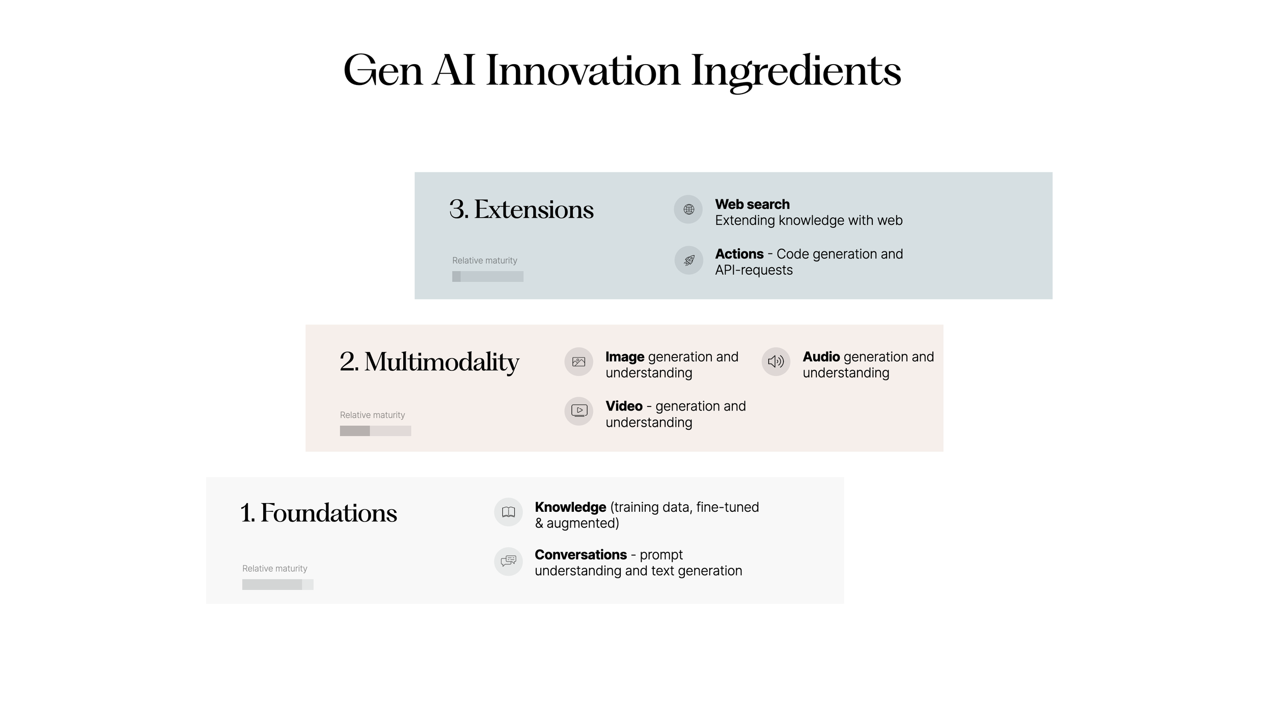 In this next wave, organizations will combine different levels of ingredients of generative AI, such as multimodality and powerful extensions.