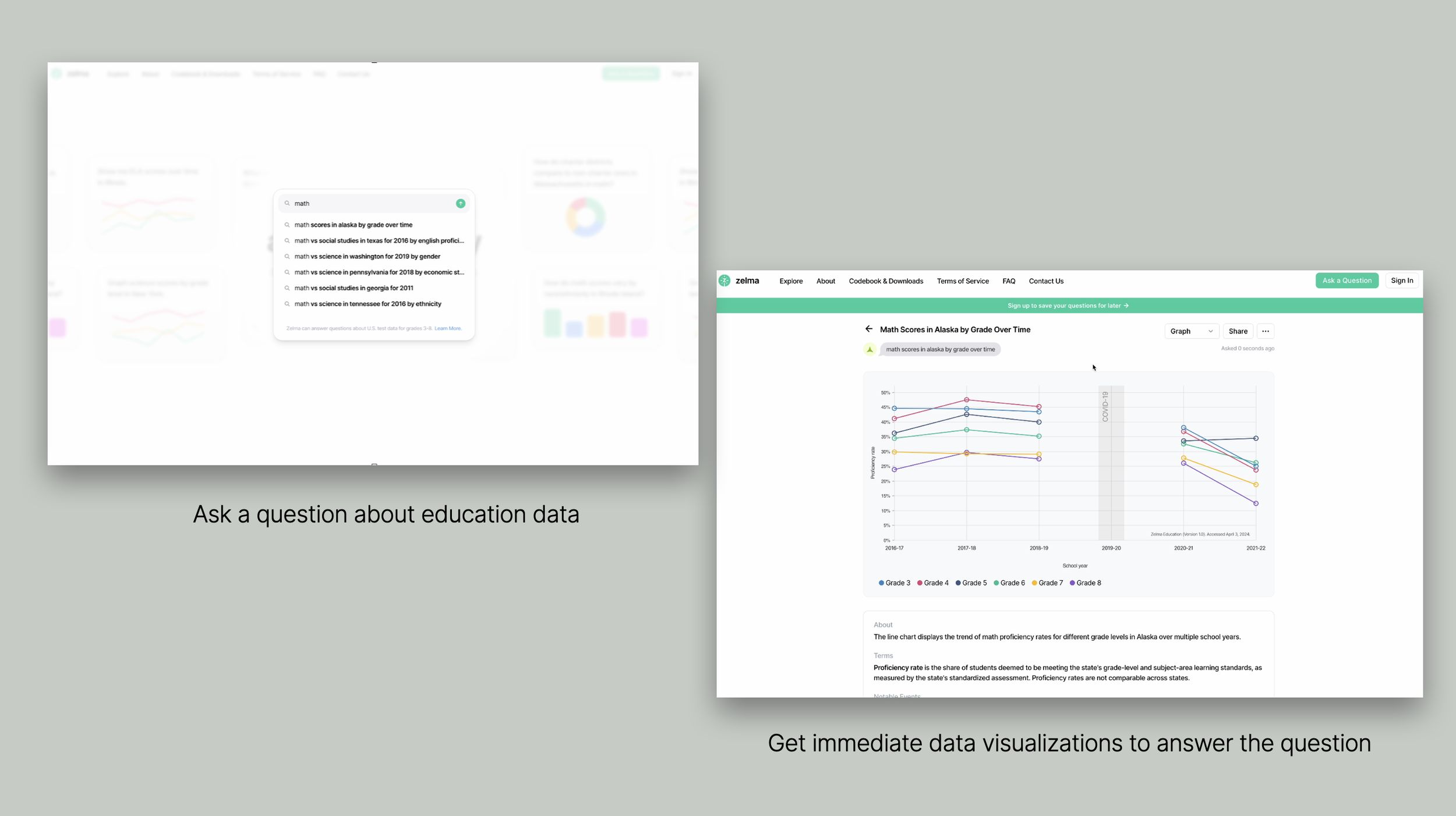 - Education non-profit Zelma aims to democratize access to educational data. With Zelma, anyone can ask questions about the data, such as “ELA Scores Over Time in South Carolina by Gender.” In seconds, Zelma creates a simple data visualization to answer the question. This unforeseen access to data helps education leaders and parents make more informed decisions.