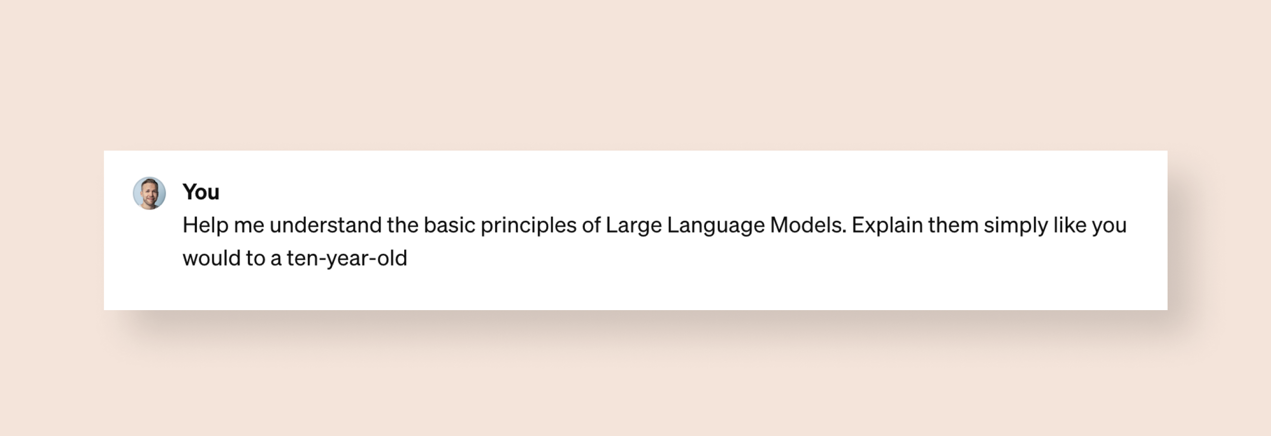 - “Help me understand the basic principles of Large Language Models. Explain them simply like you would to a ten-year-old”