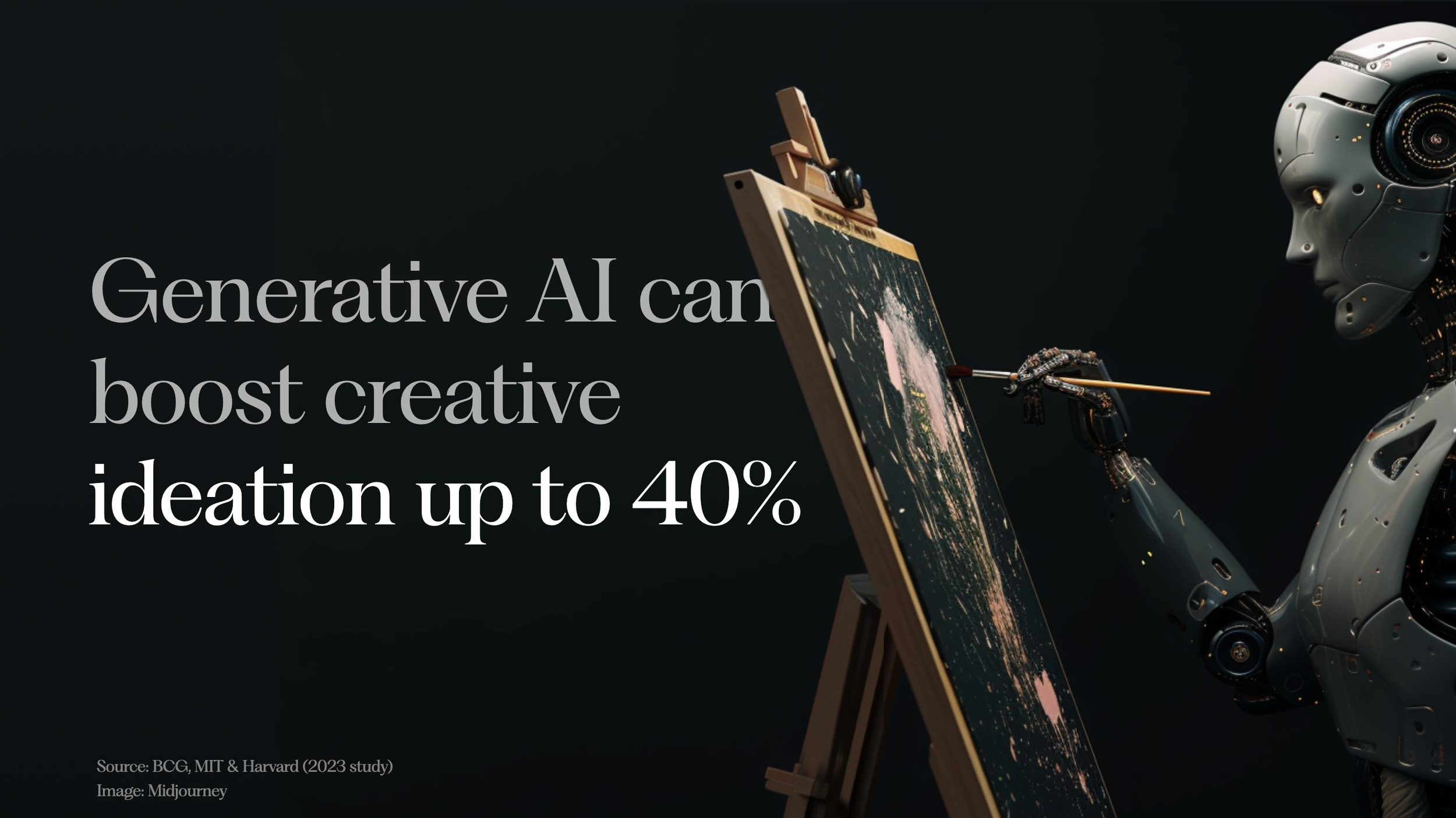 Gen AI excels at combining patterns to produce novel ideas. According to a study, its use can give people up to a 40% boost in creative ideation tasks.